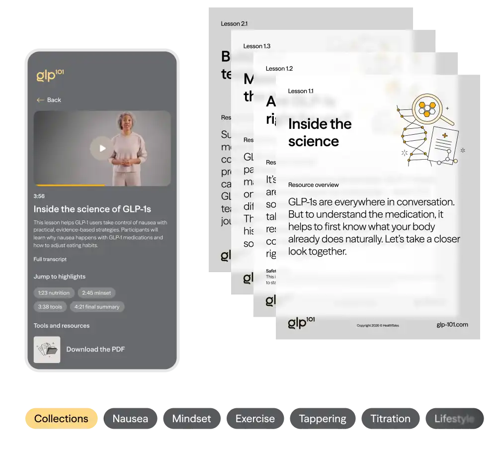 Concise. Credible. Clinically informed. Explore expert-reviewed lessons that decode GLP‑1 science, side effects, and lifestyle changes—all designed to help you stay aligned and confident on your health journey.